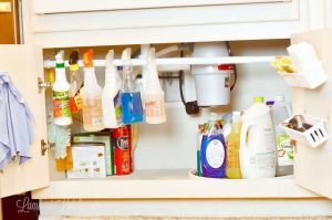Cleaning the kitchen comes with the territory! Sometimes you end up cleaning the cleaning product spills because they fell over in a mad dash to find the right one! Behold, the tension rod, a quick way to display cleaning supplies and also, have a place to hang some dish towels. Side note– we also love the idea of a lazy susan for cleaning projects, cubby holes on the side for sponges and an extra hook on the door!
